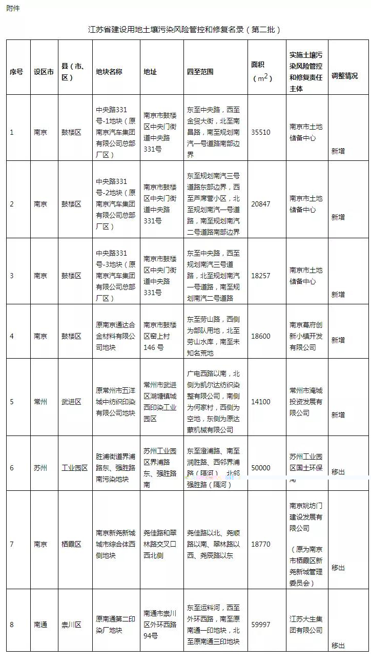 江蘇省生態環境公布廳江蘇省建設用地土壤污染風險管控和修復名錄(第二批)